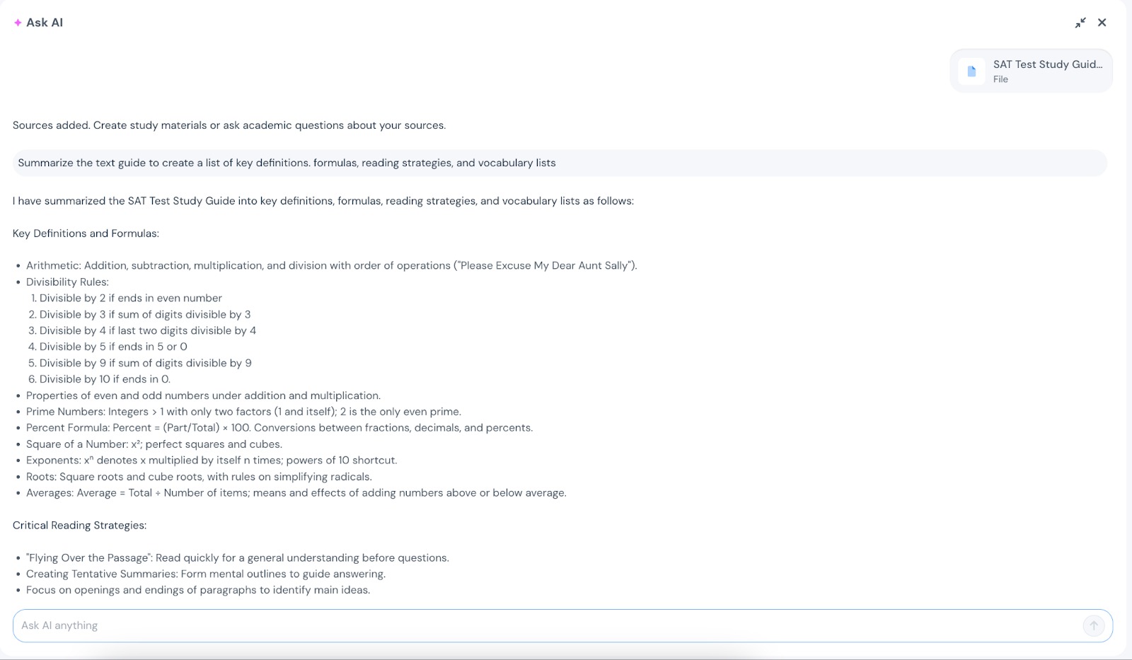- Let the Ask AI condense the content into a cheat-sheet-style overview, surfacing only the key definitions, formulas, and concepts.